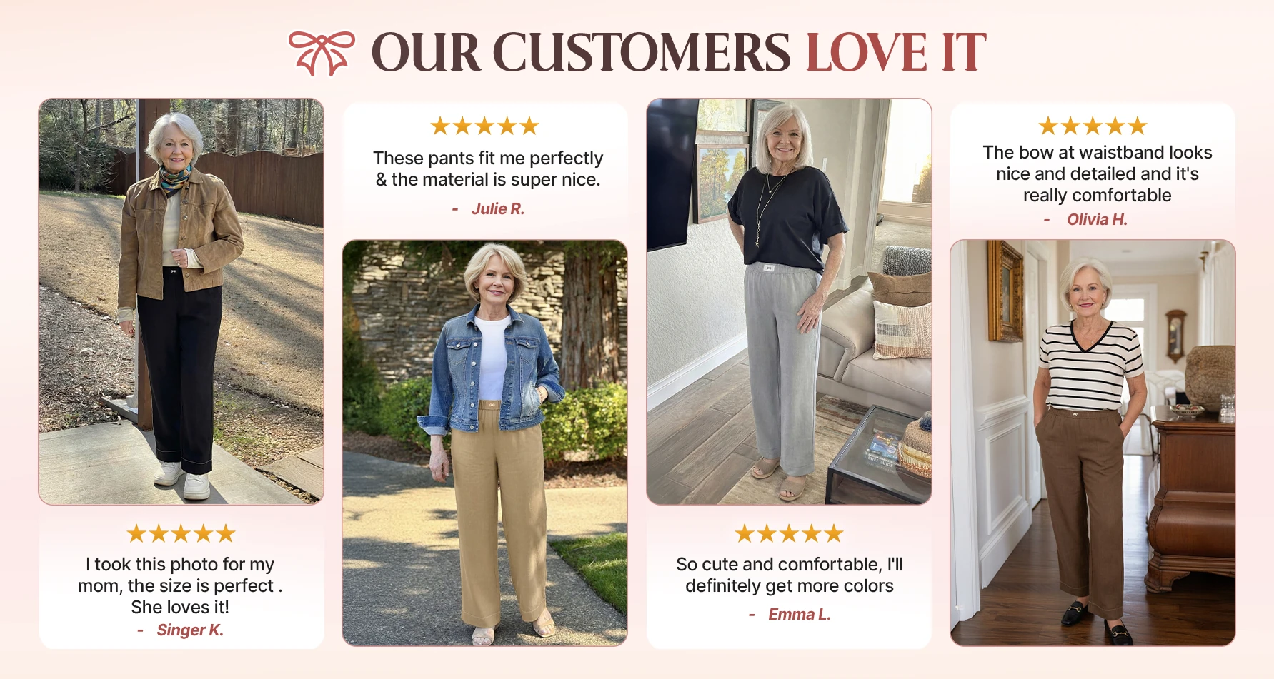 "The fabric feels smooth and cool, the waistband is so cute and stretchy, covering my belly perfectly" - Annie C